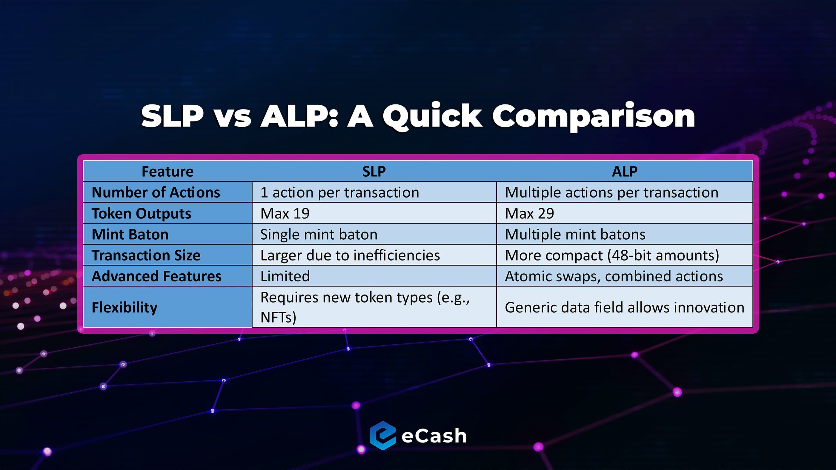 ALP uses eMPP (eCash Multi-Pushdata Protocol), which allows multiple actions or protocols to fit into a single transaction.