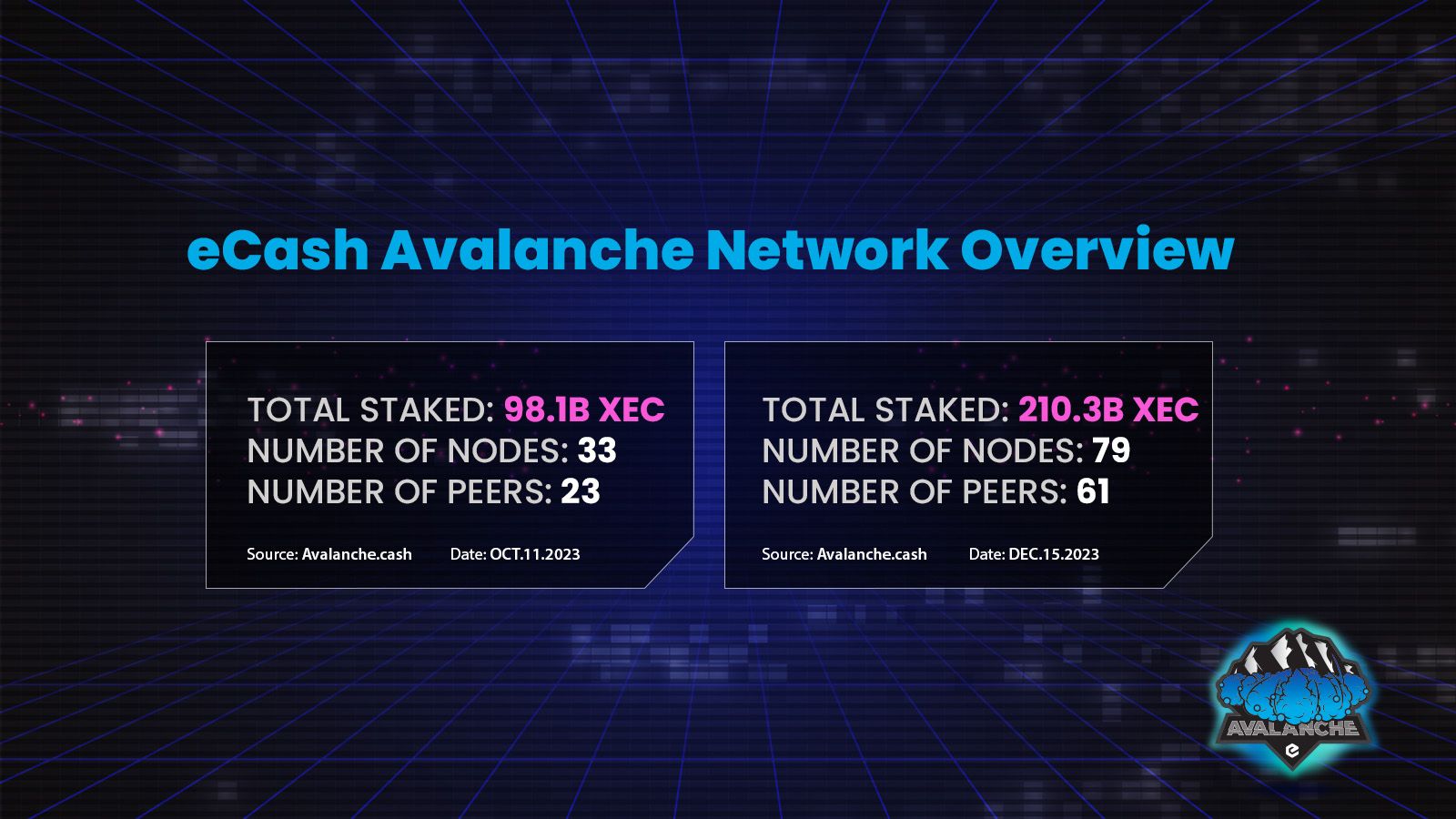 Since we announced the launch of Staking Rewards as a part of the November 15th eCash network upgrade on October 11, 2023, the eCash Avalanche network has evolved rapidly. The overall staked amount skyrocketed from 98.1 billion XEC to an impressive 210.3 billion XEC making it harder for malicious actors to attack the network. In fact, the cost of attempting a double spend on eCash surpasses that of BTC. In a hypothetical attack scenario, an entity would need 7/8 of the entire stake (unmoved for 2 weeks) as well as 51% of the hashrate to have a potential attack chance. In our opinion, eCash has integrated the most complete security model of any other Bitcoin implementation to date. The number of nodes surged from 33 to 79, and the Avalanche Peers increased from 23 to 61, and we are just getting started!
