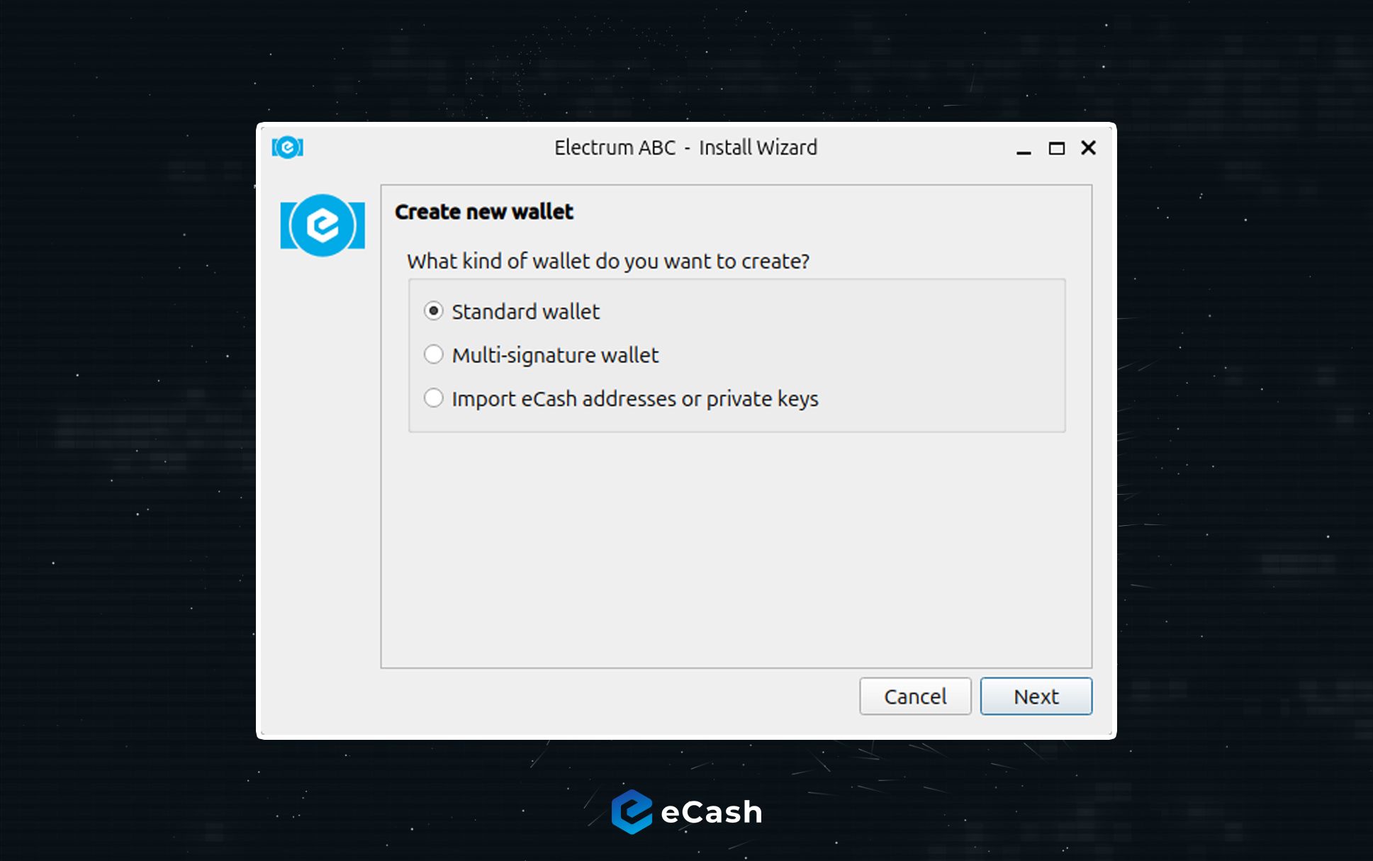 - At the Electrum ABC welcome screen, enter the desired name of your wallet and click ‘Next’. It can be any name you like.