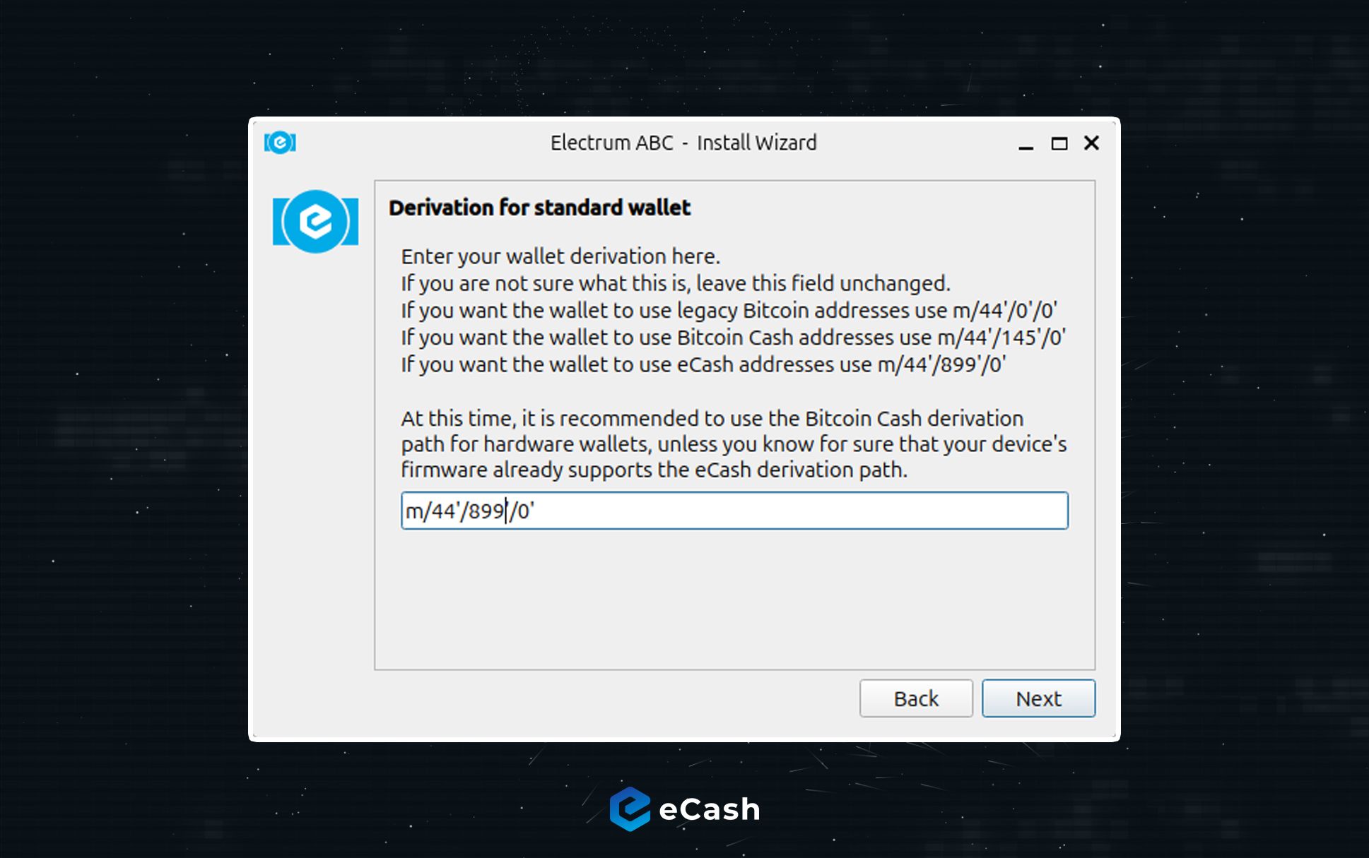 - Make sure that it is using the eCash derivation path: m/44’/899’/0’