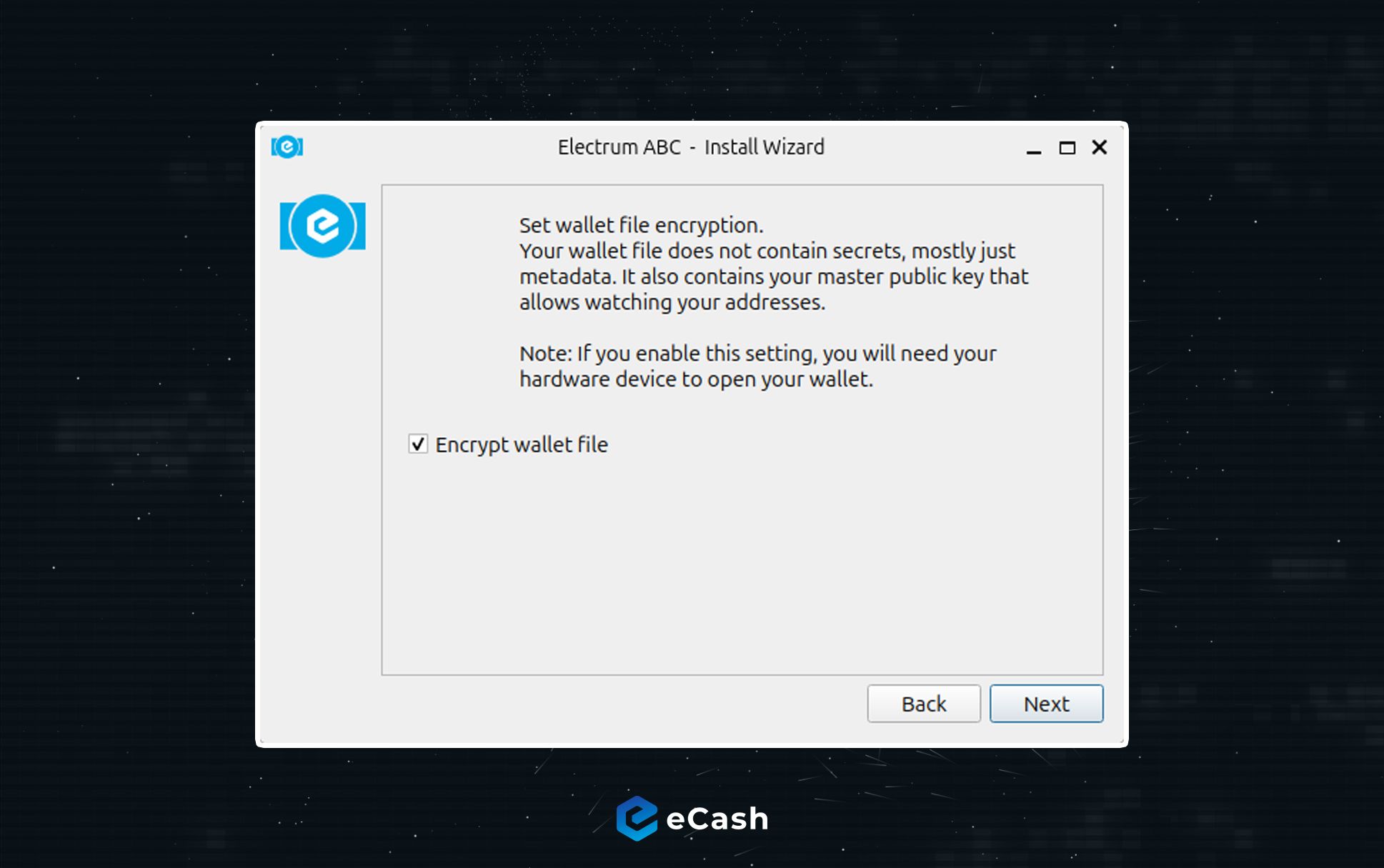 - You can encrypt your wallet file with an additional password. It’s optional but recommended. Check the “Encrypt wallet file” box and continue with “Next”. You will be prompted to set up a password which you will have to enter whenever you try to open the locally stored wallet file.