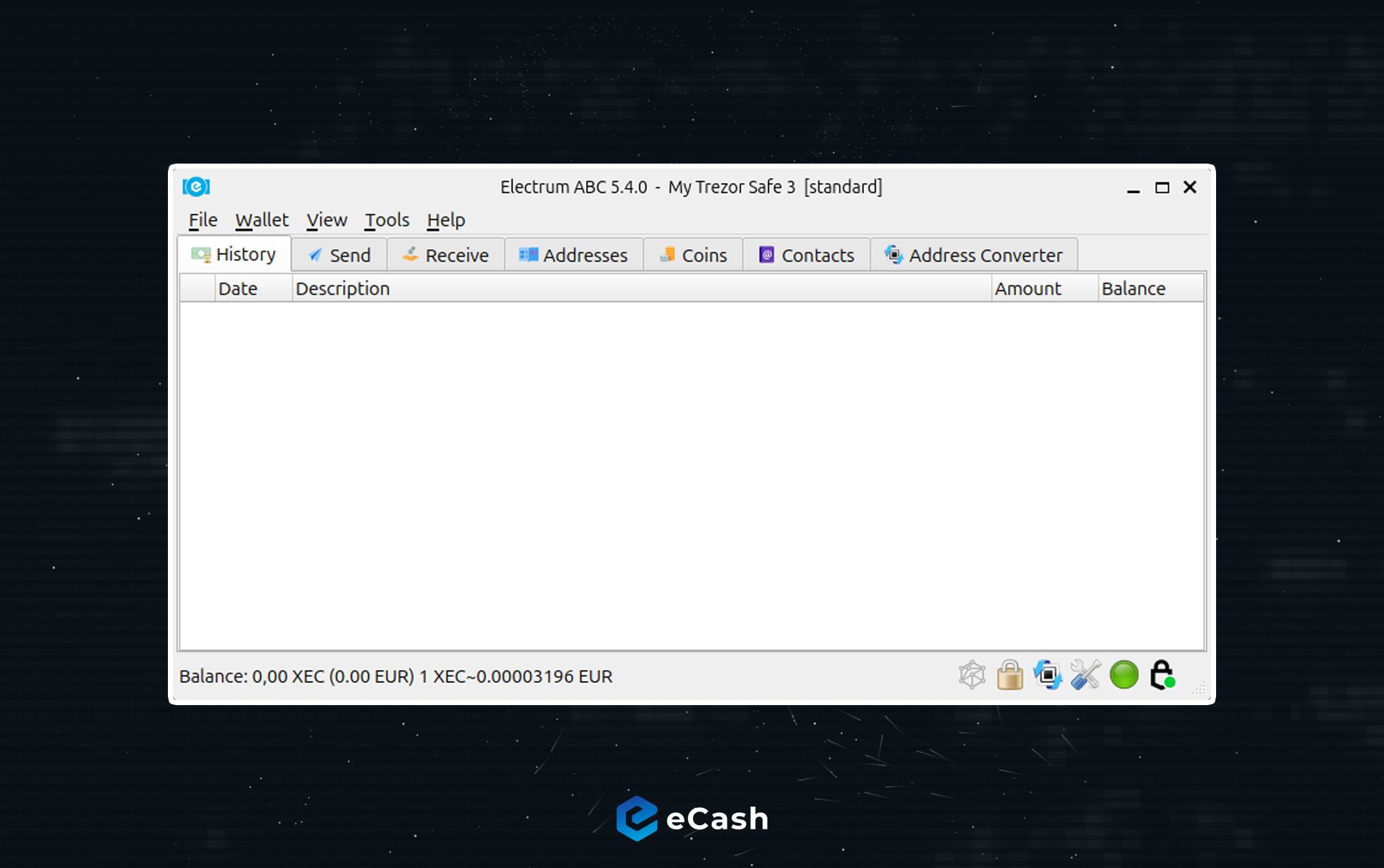 - That’s it. You have successfully created an eCash wallet with your Trezor device, using the correct address format, derivation path, denomination, and branding. You can click on the Trezor logo button in the bottom right of the app to access further options.