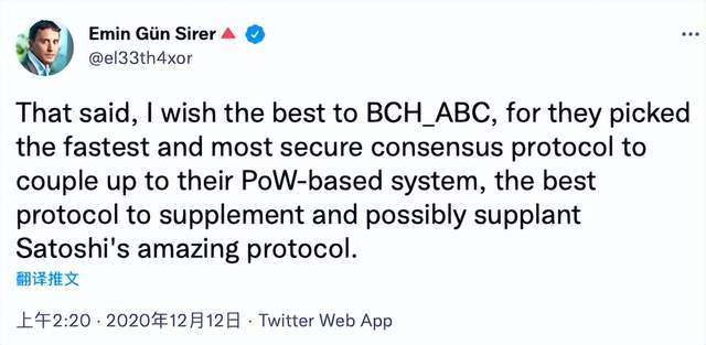 不久后,Emin Gün Sirer在twiiter上表示:希望BCH ABC(eCash)一切顺利,因为他们选择了最快和最安全的共识协议来耦合到他们基于PoW的系统,这是补充并可能取代中本聪方案的最佳选择。